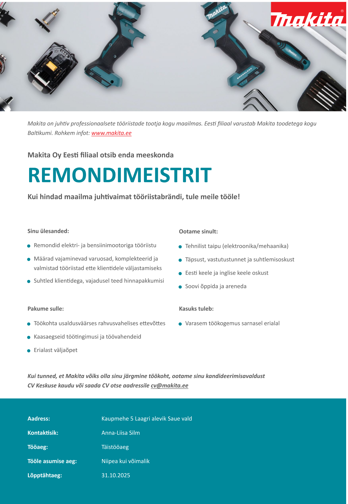 Makita – üks maailma juhtivaid elektritööriistade tootjaid. Tarnime elektri- ja sisepõlemismootoriga tööriistu ja nende tarvikuid ning Makita tööriistade hoolduseks ja remondiks spetsialiseerunud tehnikute teenust ehituse-, tööstuse- ja kodutarbijale. Makita on olnud maailma kõikidel kontinentidel professionaalide valikuks juba üle 100 aasta. Olles pikkade traditsioonidega ettevõte, on meie pilk suunatud alati tulevikku. Meie fookuses on innovatsioon, millele toetudes tegutseme ja julgustame seda tegema ka kõikidel oma töötajatel. Me ei järgi trende, vaid loome neid.